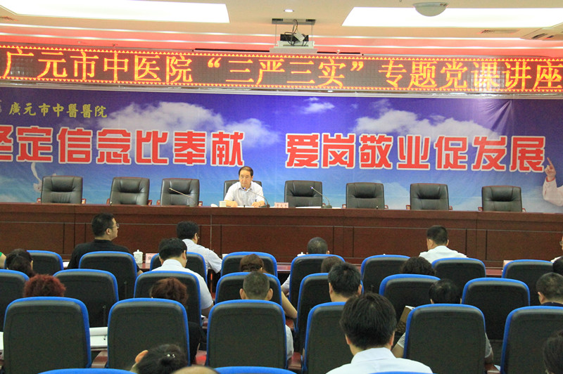 贾天贵详细阐述了“三严三实”的历史背景、深刻内涵和重要意义,指出了党员干部队伍中存在的不严不实问题,提出了整改要求。他特别强调,全院党员干部要迅速行动起来,认真对照“三严三实”要求,以“进一步改善医疗服务行动”为抓手,突出问题导向,不断提升医疗质量,强化中医特色,优化门诊服务流程,加快住院部电梯改造,持续抓好中医综合治疗区和妇产科特需医疗服务工作,全力以赴抓好“针灸科”国家级重点专科验收,不遗余力建设群众满意的“川北区域中医医疗中心”。