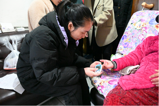 黄奶奶是一位87岁高龄独居老人,身患“急性支气管炎 、双膝关节病、糖尿病、高血压、心脏病”等多种慢性疾病,生活不能自理,日常生活全靠子女抽空上门照顾。在访视中,慢病管理团队为黄奶奶测量了血压、血糖,呼吸科刘瑛护士长为其进行了肺功能测定。经过团队健康评估后,发现黄奶奶存在中度营养不良,肺功能状态较差,营养专科护士冯秀玉现场为黄奶奶制定了饮食营养计划,刘瑛护士长细致的教黄奶奶进行了肺康复锻炼。