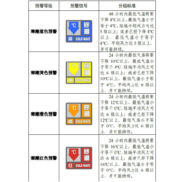 按照《寒潮预警信号及防御指南》规定,寒潮预警信号分四级。
