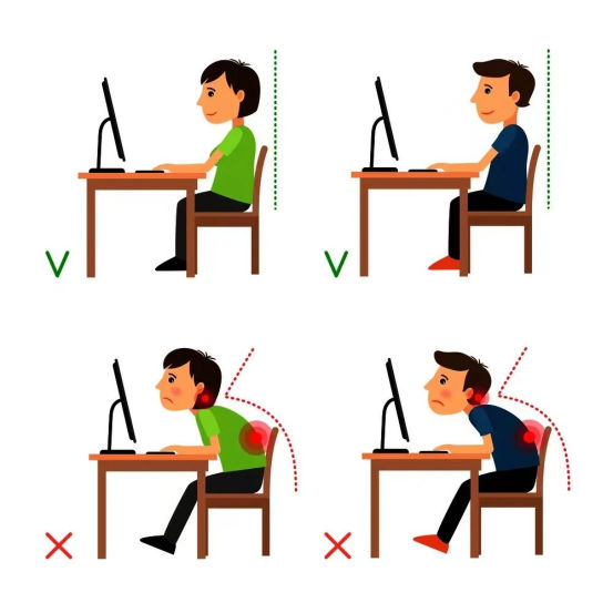保持正确坐姿。正确的坐姿要求是“坐如钟”,即坐相要像钟一样端正。时时保持颈、胸、腰挺直,避免耸肩、弓背,确保手臂、腰部有扶托,双脚着地。