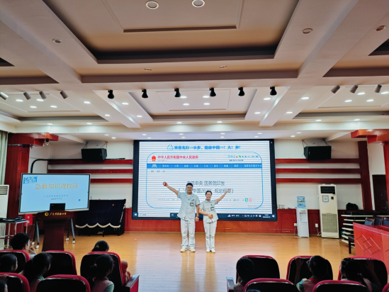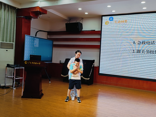 急诊科主管护师侯丽平以《急救科普进校园》为题,做专题讲座,介绍了关节扭伤、烫伤、中暑、鼻出血、噎食的急救处理方法,普及了120急救电话的拨打流程,重点示教了“剪刀、石头和布”的海姆立克急救法。