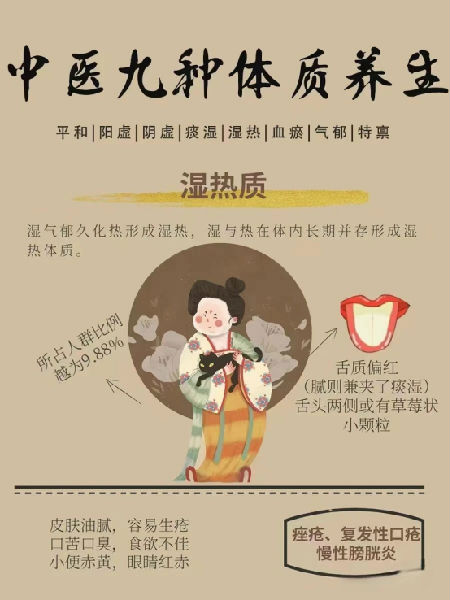 面垢油光,易生痤疮,口苦口干,身重困倦,大便黏滞不畅或燥结,小便短黄,男性易阴囊潮湿,女性易带下增多,舌质偏红,苔黄腻,脉滑数。形体特征:形体中等或偏瘦,性格多烦躁易怒,不善忍耐,不耐受炎热或湿热气候。