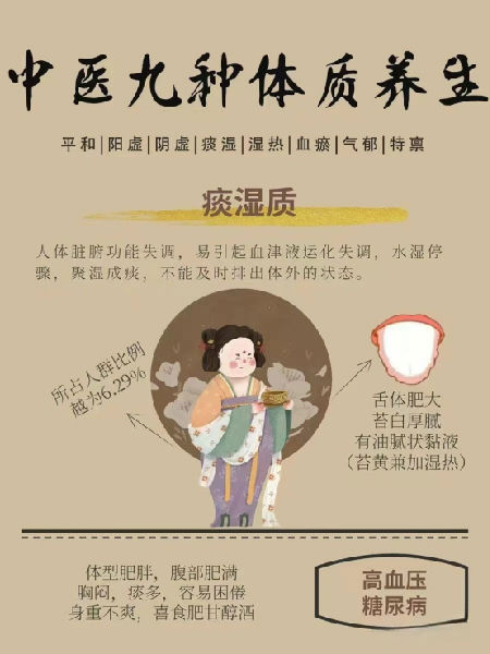 面部皮肤油脂较多,多汗且黏,胸闷,痰多,口黏腻或甜,喜食肥甘甜黏,苔腻,脉滑。形体特征:体形肥胖,腹部肥满松软,性格偏温和,善于忍耐,易患糖尿病、中风等,对梅雨季节及潮湿环境适应能力较差。