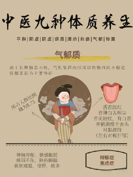 以神情抑郁、忧虑脆弱等气郁表现为主要特征,舌淡红,苔薄白,形体特征:形体瘦者为多,性格内向、敏感多虑、多愁善感,对精神刺激适应能力较差。