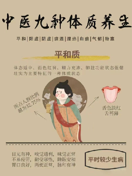 《中国公民中医养生保健素养》第32条:根据不同体质的特征制定适合自己的日常养生方法,常见的体质类型有平和质、阳虚质、阴虚质、气虚质、痰湿质、湿热质、血瘀质、气郁质、特禀质九种。