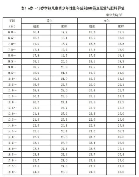 体质量指数(BMI)是国际社会推荐的评价儿童(≥2岁)超重和肥胖的首选指标,用体重(千克)除以身高(米)的平方即可。我国学龄儿童青少年超重和肥胖筛查BMI界限值如下表: