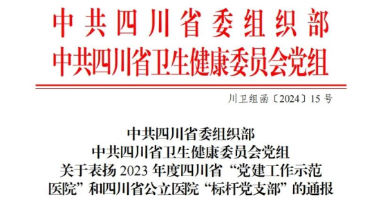 近日,中共四川省委组织部、中共四川省卫生健康委员会党组发布《关于表扬2023年度四川省“党建工作示范医院”和公立医院“标杆党支部”》的通报,广元市中医医院获评2023年度“四川省党建工作示范医院”。