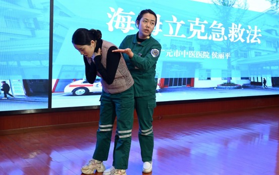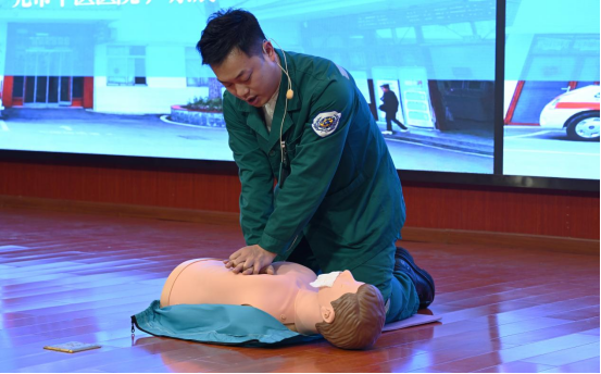 在随后进行的急救科普大课堂环节,专家团队为市民带来了一场理论与实践并重的知识盛宴。王秀蓉主任以《胸痛早识别,急救赢时间,守护生命“心”防线》为题,深入浅出地讲解了胸痛的识别、急救误区及正确处置流程。院前急救团队通过情景模拟,生动演绎了“胸痛突发-紧急呼救-现场处置”的全过程。在心肺复苏术与海姆立克急救法的实操培训中,医院急诊科医护团队进行标准化演示与一对一指导,现场参与者踊跃练习,在专业指导下切实掌握了基础急救技能。