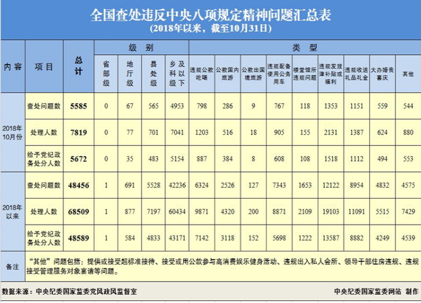2018年以来,截至10月31日,全国查处违反中央八项规定精神问题48456起,处理68509人,给予党纪政务处分48589人。