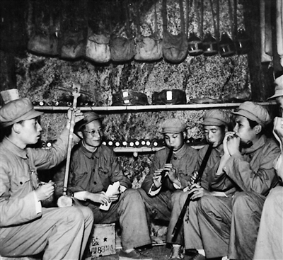 《歌唱祖国》的作者王莘(左二)在抗美援朝战场防空洞内教志愿军战士演奏这首歌曲。
