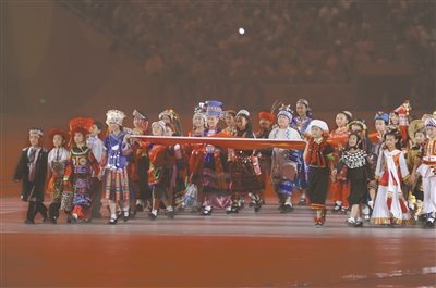 在2008年北京奥运会开幕式上,各民族儿童在《歌唱祖国》的旋律中簇拥着鲜艳的中国国旗入场。(资料图片)