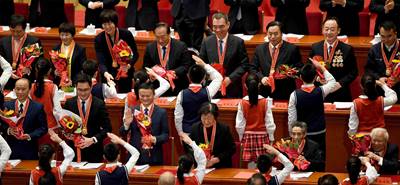 2018年12月18日,庆祝改革开放40周年大会在北京隆重举行。这是少先队员向受表彰人员献花。