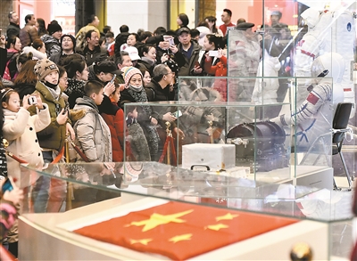 2019年2月10日,“伟大的变革——庆祝改革开放40周年大型展览”航天成就展台前人头攒动。新华社记者李贺 摄