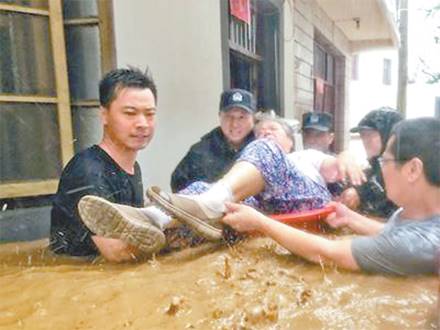受台风“利奇马”影响,8月10日下午,安徽省宁国市宁墩镇老街受到洪水侵袭,当地村干部和干警正在将一位被困家中的老人转移到安全地带。