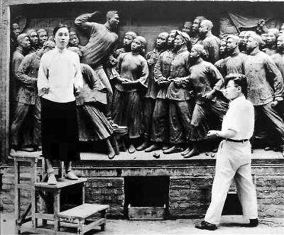 人民英雄纪念碑雕刻家在创作《五四运动》浮雕时,参照模特的形象进行雕刻。
