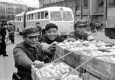 1963年,国防部授予八连“南京路上好八连”称号。这是八连战士在执勤中帮路上的菜场职工推车。唐载清 摄