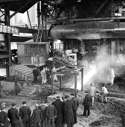1953年3月11日,我国第一座自动化的炼铁炉——鞍山钢铁公司第8号炼铁炉开始出铁了。铁水经过化验,质量很好。这是开始出铁时,冶金部门的领导同志、苏联专家等正在参观的情形。