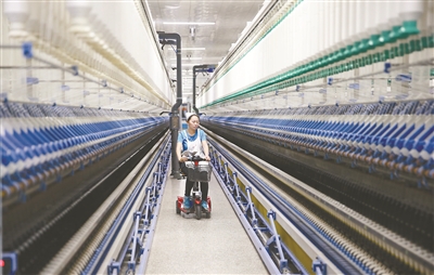 2019年1月11日,工人在山东邹平市魏桥纺织公司智能化车间对生产线进行巡检。魏桥纺织上线了“纺织+AI”人工智能车间,安装了15万个传感器的生产线上,排列整齐的各色设备运转有序,高科技改变了传统生产模式。