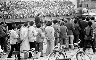 地处华北平原的北京市冬季蔬菜品种少,因此价格低廉、易贮存的大白菜成为居民饭桌上的“当家菜”。这是1988年11月12日,北京市民在一个昼夜营业的冬贮白菜销售点排队购买白菜。(资料图片)