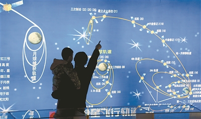 2019年4月21日,山东航天电子技术研究所举行开放日活动,市民们近距离观看各种航天装备模型和空间技术图示,学习航天和太空知识,了解我国航天发展成就,迎接4月24日“中国航天日”的到来。这是市民在航天科技展厅观看“嫦娥卫星飞行轨道图”。新华社发(唐克摄)