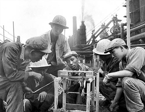 马鞍山钢铁公司,是我国江南一个重要的钢铁基地。1964年,我国第一个直径为840毫米的整体车轮在马钢诞生。这是公司二铁厂技术革新小组在研究革新高炉堵渣机的问题。新华社记者朱云风 摄