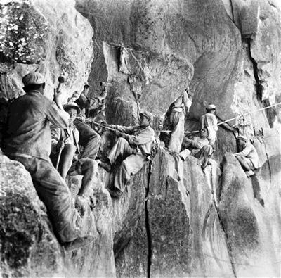 上图:1954年,修建康藏公路的筑路战士在怒江两岸的悬崖陡壁上开山修路。(资料图片)