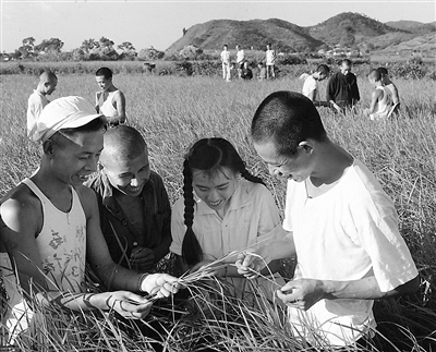 湖南省浏阳县大瑶人民公社沙螺大队党总支书记杨宏典,在领导群众生产中,善于走群众路线,很快就改变了这个生产队的穷困面貌。这是1959年10月,杨宏典和生产队的队长们在田间总结晚稻丰产的经验。(新华社记者王平 摄)