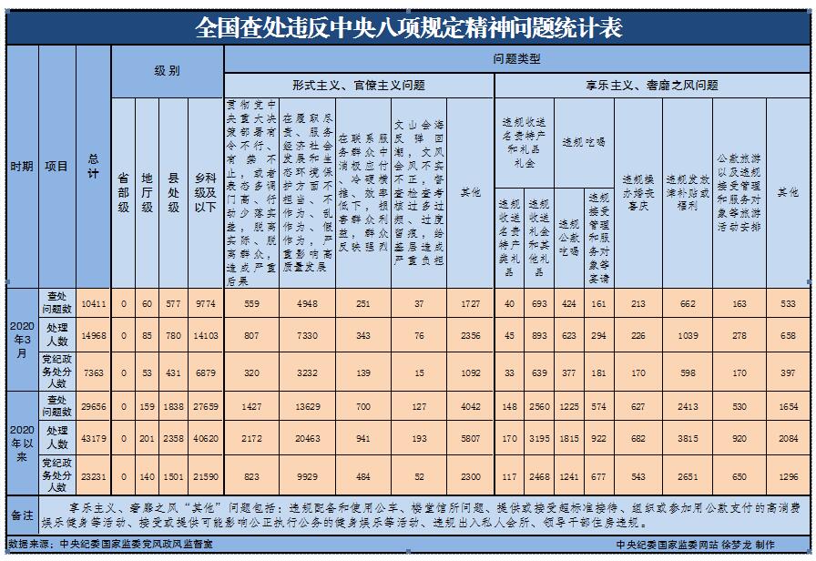 为掌握全国贯彻落实中央八项规定精神情况,中央纪委国家监委在各省区市和新疆生产建设兵团、各中央和国家机关、各中央企业和中央金融企业等建立了落实中央八项规定精神情况月报制度。2020年以来,截至3月31日,全国查处违反中央八项规定精神问题情况如下: