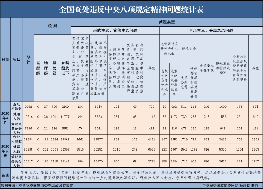 为掌握全国贯彻落实中央八项规定精神情况,中央纪委国家监委在各省区市和新疆生产建设兵团、各中央和国家机关、各中央企业和中央金融企业等建立了落实中央八项规定精神情况月报制度。2020年以来,截至4月30日,全国查处违反中央八项规定精神问题情况如下: