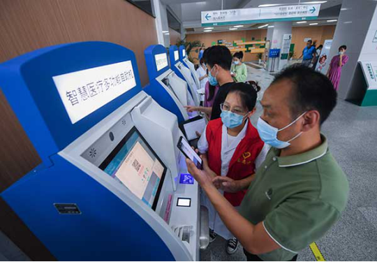 浙江省湖州市吴兴区人民医院围绕服务便利化、智慧化、人性化、特色化、规范化的要求,建设智慧医疗服务项目,为居民就医提供便利。图为一名居民在吴兴区人民医院医护人员的指导下,使用智慧医疗多功能自助机支付医药费。新华社记者 徐昱 摄