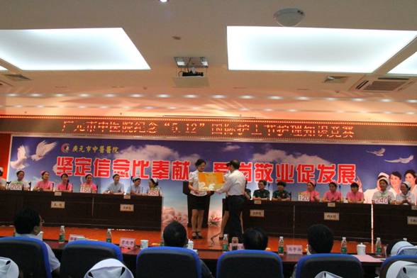 5月10日下午,市中医院举行了庆祝5.12国际护士节护理知识竞赛。经过笔试,赛选出6个队进入决赛。院长贾天贵作了热情洋溢的致辞,他对各位护理战线的同志们表示节日的祝贺,感谢他们长期以来为医院发展建设所做出的贡献。经过激烈角逐,上西分院代表队夺得第一名,急诊科代表队夺得第二名,手术室代表队夺得第三名。