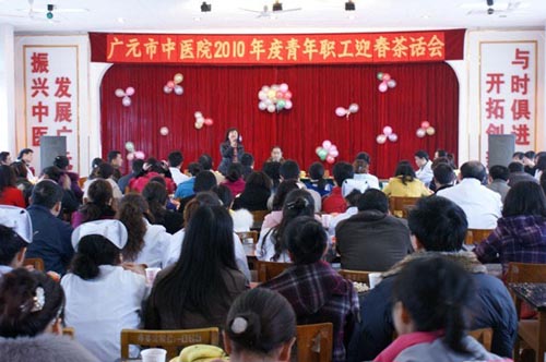 春节大假刚过,2月23日下午,广元市中医院五楼会议室被彩色气球装饰一新,“2010年青年职工新春茶话会”在轻松、热烈的气氛中进行。院长贾天贵、副院长岳良明、纪委书记汤业军以及部分职能科室干部参加了茶话会,会议由工会主席李晓春主持。