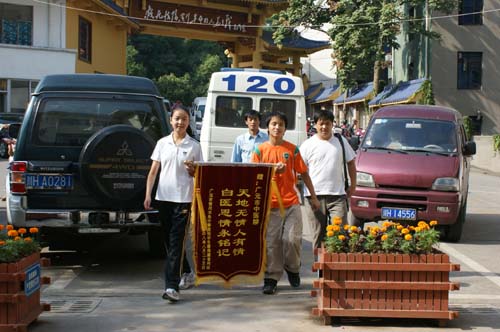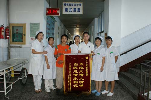 唐海、唐雪梅是青川县木鱼中学的学生,5.12大地震中被倒塌的校舍掩埋了20多个小时,被救后紧急送往我院接受治疗,由于右腿压在倒塌的墙体下时间太久,已经缺血性坏死不得以截去右下肢。在医院住院期间,医务人员对这批青川伤员倾注全部的爱心,使他们从地震的恐惧中解脱出来,重新鼓起了生活的勇气。目前,他们已装上了假肢行走自如,送了锦旗后还来到骨科病区看望了关心、爱护他们的医护人员。