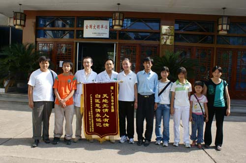 8月25日,因地震受伤分别被截去右下肢的唐海、唐雪梅和家人把一面锦旗送到副院长岳良明的手中,上面写着“天地无情人有情、白衣恩情永铭记”。