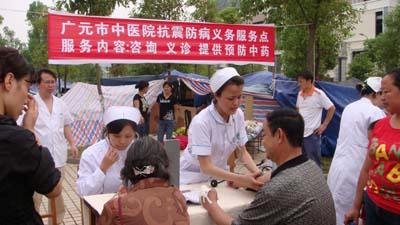 为确保大灾之后无大疫,加强对灾后疫情的防控,把损失降到最低程度,广元市中医院充分利用中医药“治未病”优势, 13日起,组织院内专家开具了预防肠道传染病、中暑等疾病的中药协定处方,煎成汤剂免费让伤员、义工以及职工服用。市中医院未雨绸缪的义举,受到前来指导抗震救灾工作的国家中医药管理局查德忠司长、省中医药管理局杨殿兴局长的一致好评。