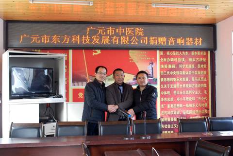 成都中联信息产业有限公司、广元市东方科技发展公司是我院业务联系单位,当得知我院精准扶贫村“利州区白朝乡观音村”会议室急需添置一块电子显示屏和会议音响设备时,成都中联信息产业有限公司积极主动捐赠了一块价值5000余元的电子显示屏,广元市东方科技发展公司积极主动捐赠了一套价值2000余元的会议音响设备,并于2016年1月21日安装调试到位,以实际行动响应国家精准扶贫号召,支持了广元市中医院精准扶贫工作,受到医院和观音村干部群众的好评。