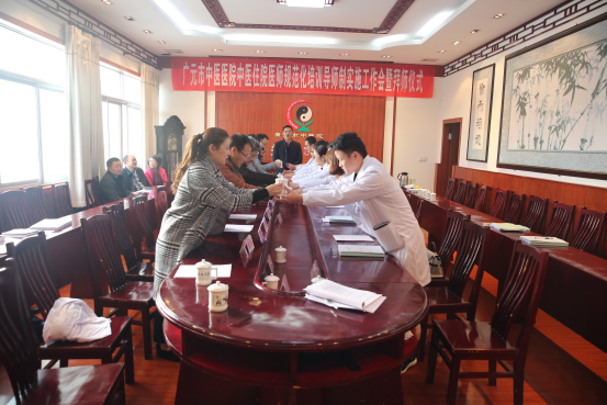 我院遴选出具有丰富理论和实践经验的15名省、市名中医,作为20名中医住院医师规范化培训学员的导师。现场举行了简单而庄严的拜师仪式,仪式上学员们给导师鞠躬行礼、奉茶。导师代表陈兵,学员代表杨福权分别进行了发言。导师们表示,将把自己临床、经验和学术技术专长,毫无保留地传授给徒弟们,做好带教工作,严格要求学员,让中医事业后继有人、发扬光大、造福人民。学员代表表示,绝不辜负医院领导和师傅期望,在以后的学习工作中,虚心请教,潜心钻研,把博大精深的中医文化传承下去。