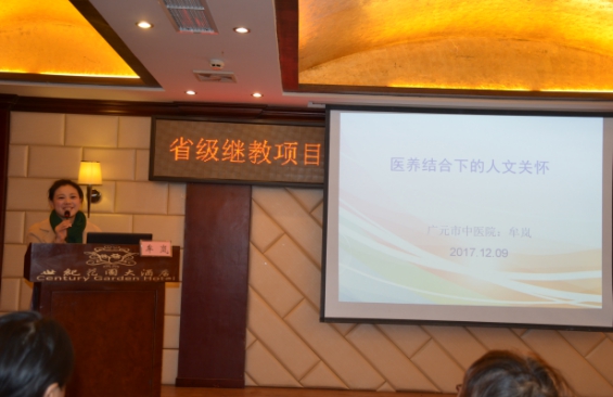 12月8日-10日,我院在广元世纪花园大酒店成功举办了省级继教项目“医养结合服务护理质量管理及中医技术运用”暨市级继教项目“中医护理质量管理及老年护理进展”培训班。来自市内外150余名医务人员参加培训。医院副院长汤业军主持开幕式,党委书记岳先远致欢迎辞。市卫计委调研员吴玲到会并作了讲话。