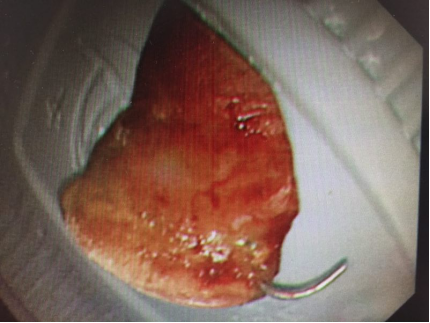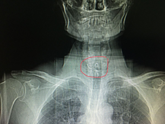 接诊的杨涛医生给予急查胸片、颈部CT提示:“胸1椎体见不规则金属物影,食管右侧壁见线状金属异物,穿出长度约0.8cm”。因假牙已经穿破食管壁,病人随时都有生命危险,情况危急,杨医生立邀麻醉科、耳鼻喉科、呼吸内科会诊。决定先行“内镜下食管异物取出术”。