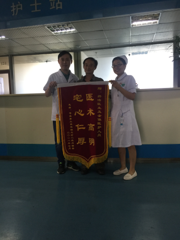 出院没过几天,刘老太爷高兴的给杨医生送来一面锦旗,泪水不停的在眼眶内打转,激动的说到:“中医院医生的技术真是好啊,医德高,没开刀就把这个牙拿出来了,救了我一命,我一辈子都要谢谢你们!”