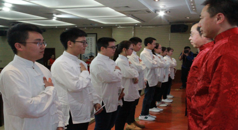 拜师仪式上,师父(导师)身着深红色唐装,正襟端坐。徒弟深弯腰向师傅鞠躬,递交拜师帖。