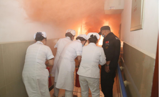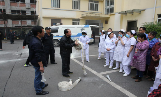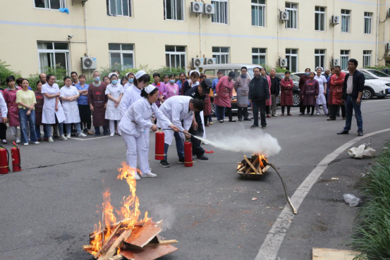 消防演练从发现室内火情、报告总值班、启动消防应急预案、医务人员抢救重症伤员、疏散病人、工作人员应急逃生,到灭火器的操作使用、消防水枪的铺设使用,整个演练过程秩序井然。