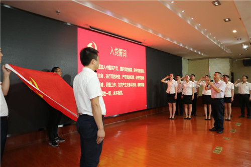 “我志愿加入中国共产党……”党旗庄严而神圣,入党誓词激荡回响。党委书记岳先远带领新入党的党员,面对党旗,庄严举起右手,进行入党宣誓,台下的党员干部们也一道重温了入党誓词。