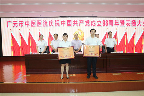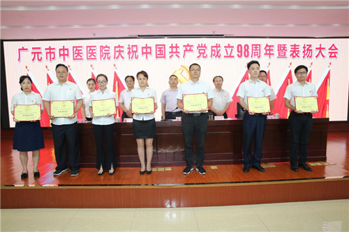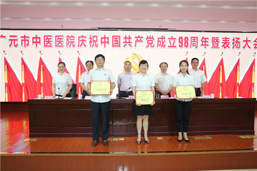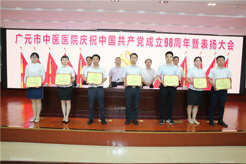 广元市中医院副院长岳良明宣读了院党委《关于“七一”表彰先进党支部优秀党务工作者优秀共产党员的决定》文件。获得先进党支部的是:大内科党支部、行管后勤党支部。获得优秀党务工作者的是:门诊党支部书记陈琼枝,行管后勤党支部书记何永葆,大针灸科党支部书记余佳。获得优秀共产党员的是:朱敏、李松林、杨杰、陈太全、赵广飞、张静等15人。与会领导为他们颁发了奖状和荣誉证书。