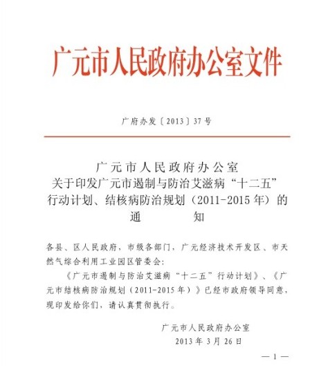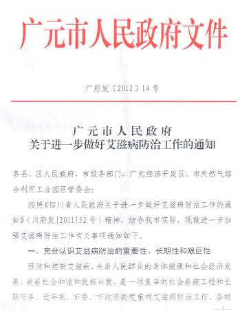1、艾滋病防治纲领:《传染病防治法》、《艾滋病防治条例》、《广元市人民政府关于进一步做好艾滋病防治工作的通知》、《广元市遏制与防治艾滋病“十二五”行动计划(2011-2015年)》,《广元市艾滋病病毒感染者及病人服务管理工作方案》、《关于发放艾滋病病毒感染儿童基本生活费通知》、《广元市公共场所预防艾滋病推广使用安全套实施方案》、《广元市预防艾滋病、梅毒、乙肝母婴传播实施方案》等。