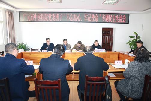 2019年12月10日下午,广元市中医医院党委班子在行政楼一会议室召开了“不忘初心、牢记使命”专题民主生活会。会议由院党委书记岳先远主持,市委主题教育第十三巡回指导组组长王学敏和指导组成员毛永能科长亲自到会指导,院党委班子成员全员参会。