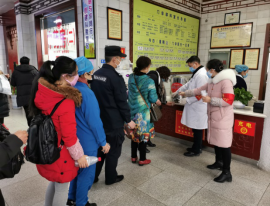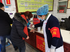 图为预检分诊党员志愿者在对进院人员体温检查、预检分诊