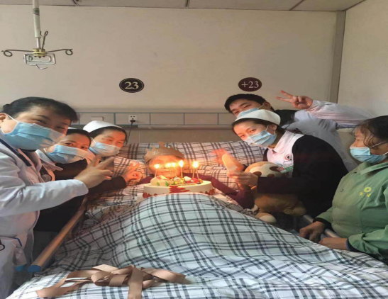 得知这一消息,科主任和护士长立即与大家商量,“不能让疫情把爱阻隔,不能让这位老人和家属失望,我们来陪老人过一个幸福快乐的生日”, 大家纷纷说道。当音乐声响起,医护人员手捧插满蜡烛的蛋糕和鲜花,大家用生日快乐歌为老人送去祝福时,我们看到了老人嘴角的微笑,听到了手机那边亲人们开心的祝福和对医护人员赞美之声。这一刻,我们感受到了爱的暖流在传递,感受到了白衣天使的价值,战疫情更充满了勇气和信心……