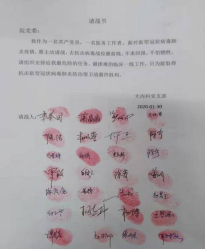 在疫情爆发的关键时刻,大内科党支部党员干部闻讯而动,主动请缨,以“救死扶伤、大爱无疆”的医者情怀,以“我自愿到抗击病毒最前线参与救治工作,不惧生死!”的铮铮誓言,集体向组织递交了请战书,满满鲜红的手印是他们对党和人民的庄严承诺。