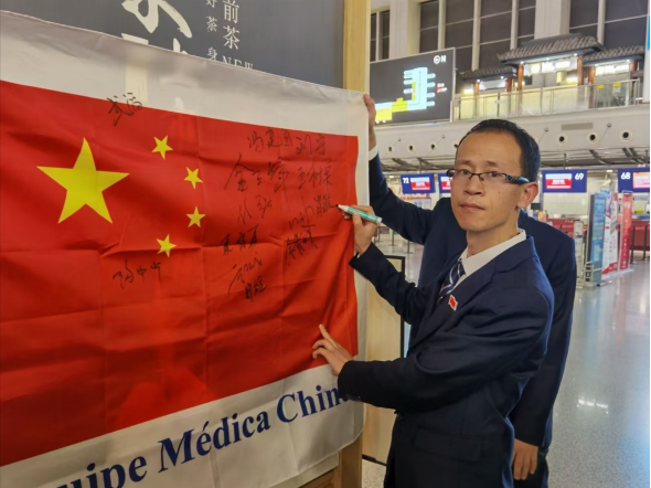 肖敏在鲜红的旗帜上郑重的写下了自己的名字。“我将牢记祖国赋予的使命,牢记医院领导的嘱托。把中华民族热爱和平、团结友善的精神,博大精深的中医文化以及广元市中医院的优秀专业技术带到异国他乡。”